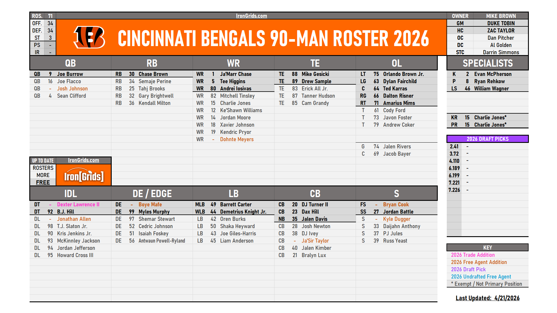 HEADS UP! This page updates once per week every Tuesday. To see the most recent version updated daily & archived rosters, visit our Discord server’s FREE Bengals Channel: DISCORD DISCORD Bookmark this page for quick access! AFC ROSTERS EAST BILLS BILLS DOLPHINS DOLPHINS JETS JETS PATRIOTS PATRIOTS NORTH RAVENS RAVENS BENGALS BENGALS BROWNS BROWNS STEELERS STEELERS SOUTH TEXANS TEXANS COLTS COLTS TITANS TITANS JAGUARS JAGUARS WEST BRONCOS BRONCOS CHIEFS CHIEFS CHARGERS CHARGERS RAIDERS RAIDERS NFC ROSTERS EAST COWBOYS COWBOYS GIANTS GIANTS COMMANDERS COMMANDERS EAGLES EAGLES NORTH BEARS BEARS LIONS LIONS PACKERS PACKERS VIKINGS VIKINGS SOUTH FALCONS FALCONS PANTHERS PANTHERS BUCCANEERS BUCCANEERS SAINTS SAINTS WEST CARDINALS CARDINALS RAMS RAMS SEAHAWKS SEAHAWKS 49ERS 49ERS IRONGRIDS ORIGINALS STANDINGS, SCHEDULES & LANDSCAPES: POCKET SCHEDULE POCKET SCHEDULE SEASON BOARD SEASON BOARD QB LANDSCAPE QB LANDSCAPE COACHING LANDSCAPE COACHING LANDSCAPE TOOLS: OFFSEASON TEMPLATES OFFSEASON TEMPLATES 1ST ROUND DRAFT BOARD 1ST ROUND DRAFT BOARD