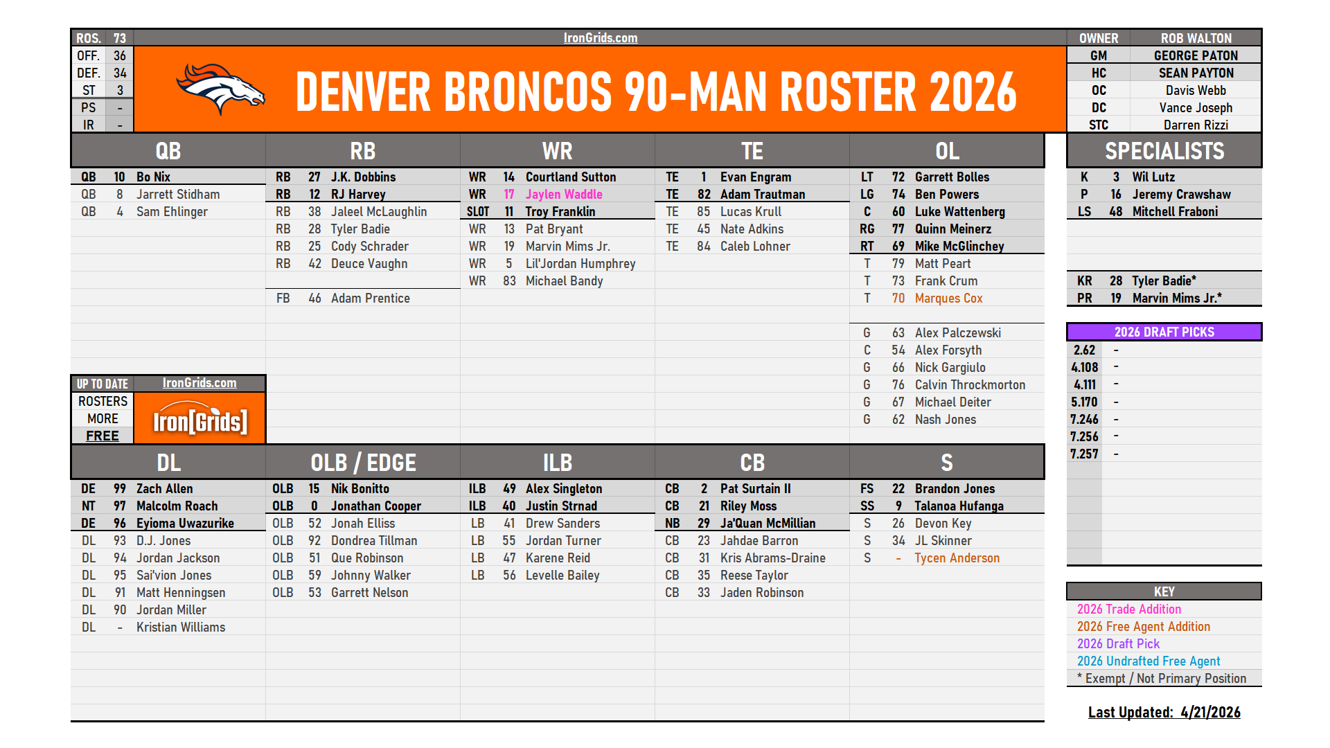 HEADS UP! This page updates once per week every Tuesday. To see the most recent version updated daily & archived rosters, visit our Discord server’s FREE Broncos Channel: DISCORD DISCORD Bookmark this page for quick access! AFC ROSTERS EAST BILLS BILLS DOLPHINS DOLPHINS JETS JETS PATRIOTS PATRIOTS NORTH RAVENS RAVENS BENGALS BENGALS BROWNS BROWNS STEELERS STEELERS SOUTH TEXANS TEXANS COLTS COLTS TITANS TITANS JAGUARS JAGUARS WEST BRONCOS BRONCOS CHIEFS CHIEFS CHARGERS CHARGERS RAIDERS RAIDERS NFC ROSTERS EAST COWBOYS COWBOYS GIANTS GIANTS COMMANDERS COMMANDERS EAGLES EAGLES NORTH BEARS BEARS LIONS LIONS PACKERS PACKERS VIKINGS VIKINGS SOUTH FALCONS FALCONS PANTHERS PANTHERS BUCCANEERS BUCCANEERS SAINTS SAINTS WEST CARDINALS CARDINALS RAMS RAMS SEAHAWKS SEAHAWKS 49ERS 49ERS IRONGRIDS ORIGINALS STANDINGS, SCHEDULES & LANDSCAPES: POCKET SCHEDULE POCKET SCHEDULE SEASON BOARD SEASON BOARD QB LANDSCAPE QB LANDSCAPE COACHING LANDSCAPE COACHING LANDSCAPE TOOLS: OFFSEASON TEMPLATES OFFSEASON TEMPLATES 1ST ROUND DRAFT BOARD 1ST ROUND DRAFT BOARD