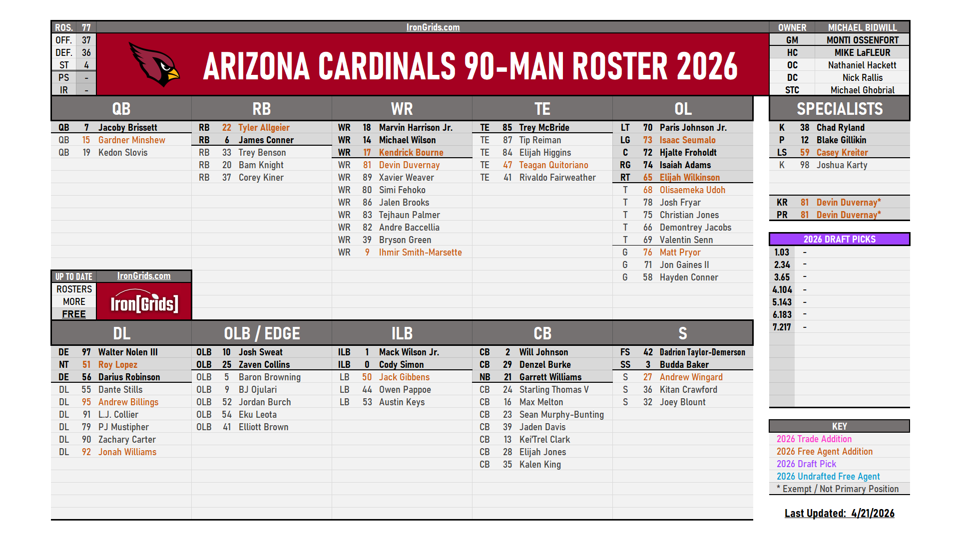 HEADS UP! This page updates once per week every Tuesday. To see the most recent version updated daily & archived rosters, visit our Discord server’s FREE Cardinals Channel: DISCORD DISCORD Bookmark this page for quick access! AFC ROSTERS EAST BILLS BILLS DOLPHINS DOLPHINS JETS JETS PATRIOTS PATRIOTS NORTH RAVENS RAVENS BENGALS BENGALS BROWNS BROWNS STEELERS STEELERS SOUTH TEXANS TEXANS COLTS COLTS TITANS TITANS JAGUARS JAGUARS WEST BRONCOS BRONCOS CHIEFS CHIEFS CHARGERS CHARGERS RAIDERS RAIDERS NFC ROSTERS EAST COWBOYS COWBOYS GIANTS GIANTS COMMANDERS COMMANDERS EAGLES EAGLES NORTH BEARS BEARS LIONS LIONS PACKERS PACKERS VIKINGS VIKINGS SOUTH FALCONS FALCONS PANTHERS PANTHERS BUCCANEERS BUCCANEERS SAINTS SAINTS WEST CARDINALS CARDINALS RAMS RAMS SEAHAWKS SEAHAWKS 49ERS 49ERS IRONGRIDS ORIGINALS STANDINGS, SCHEDULES & LANDSCAPES: POCKET SCHEDULE POCKET SCHEDULE SEASON BOARD SEASON BOARD QB LANDSCAPE QB LANDSCAPE COACHING LANDSCAPE COACHING LANDSCAPE TOOLS: OFFSEASON TEMPLATES OFFSEASON TEMPLATES 1ST ROUND DRAFT BOARD 1ST ROUND DRAFT BOARD