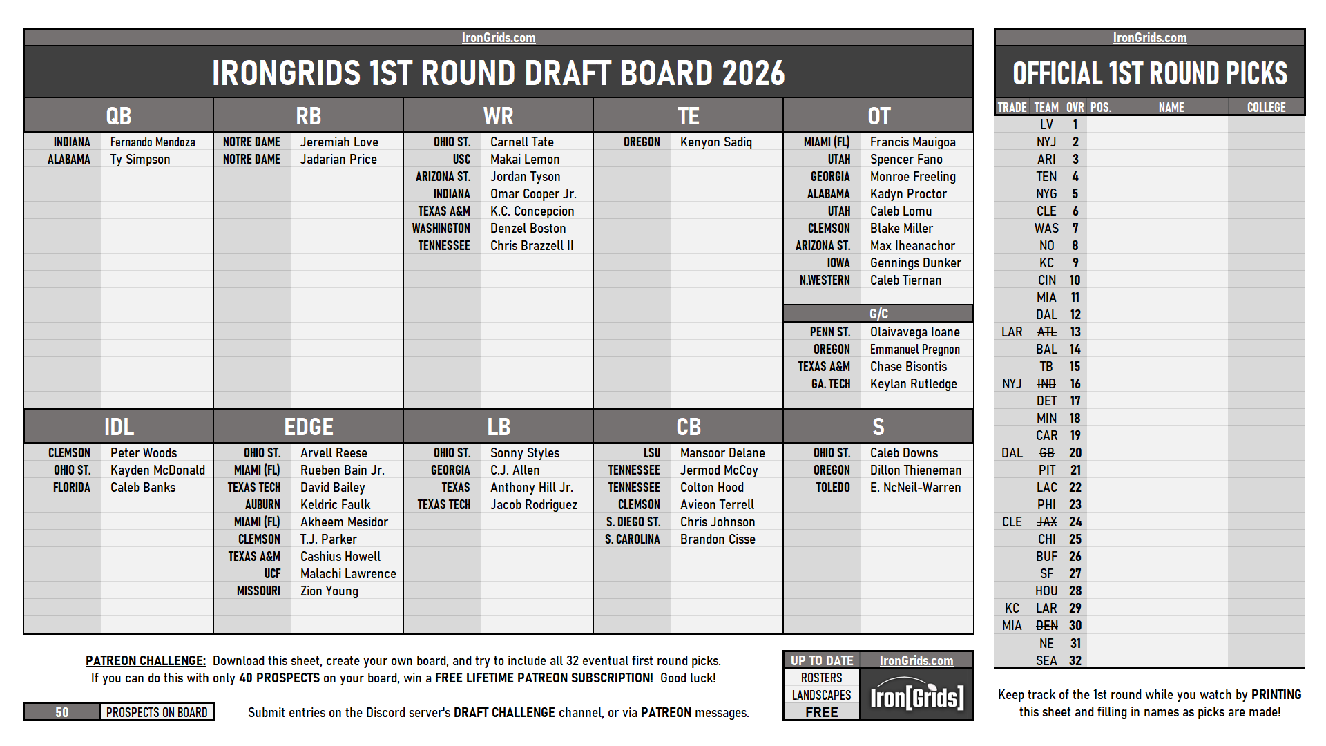 Download this sheet as a PDF for FREE from our Discord server! Print it, and fill it out while you watch the 1st round of the draft! To enter the challenge, subscribe on Patreon and head to our Discord server’s Draft Challenge Channel: DISCORD DISCORD AFC ROSTERS EAST BILLS BILLS DOLPHINS DOLPHINS JETS JETS PATRIOTS PATRIOTS NORTH RAVENS RAVENS BENGALS BENGALS BROWNS BROWNS STEELERS STEELERS SOUTH TEXANS TEXANS COLTS COLTS TITANS TITANS JAGUARS JAGUARS WEST BRONCOS BRONCOS CHIEFS CHIEFS CHARGERS CHARGERS RAIDERS RAIDERS NFC ROSTERS EAST COWBOYS COWBOYS GIANTS GIANTS COMMANDERS COMMANDERS EAGLES EAGLES NORTH BEARS BEARS LIONS LIONS PACKERS PACKERS VIKINGS VIKINGS SOUTH FALCONS FALCONS PANTHERS PANTHERS BUCCANEERS BUCCANEERS SAINTS SAINTS WEST CARDINALS CARDINALS RAMS RAMS SEAHAWKS SEAHAWKS 49ERS 49ERS IRONGRIDS ORIGINALS STANDINGS, SCHEDULES & LANDSCAPES: POCKET SCHEDULE POCKET SCHEDULE SEASON BOARD SEASON BOARD QB LANDSCAPE QB LANDSCAPE COACHING LANDSCAPE COACHING LANDSCAPE TOOLS: OFFSEASON TEMPLATES OFFSEASON TEMPLATES 1ST ROUND DRAFT BOARD 1ST ROUND DRAFT BOARD