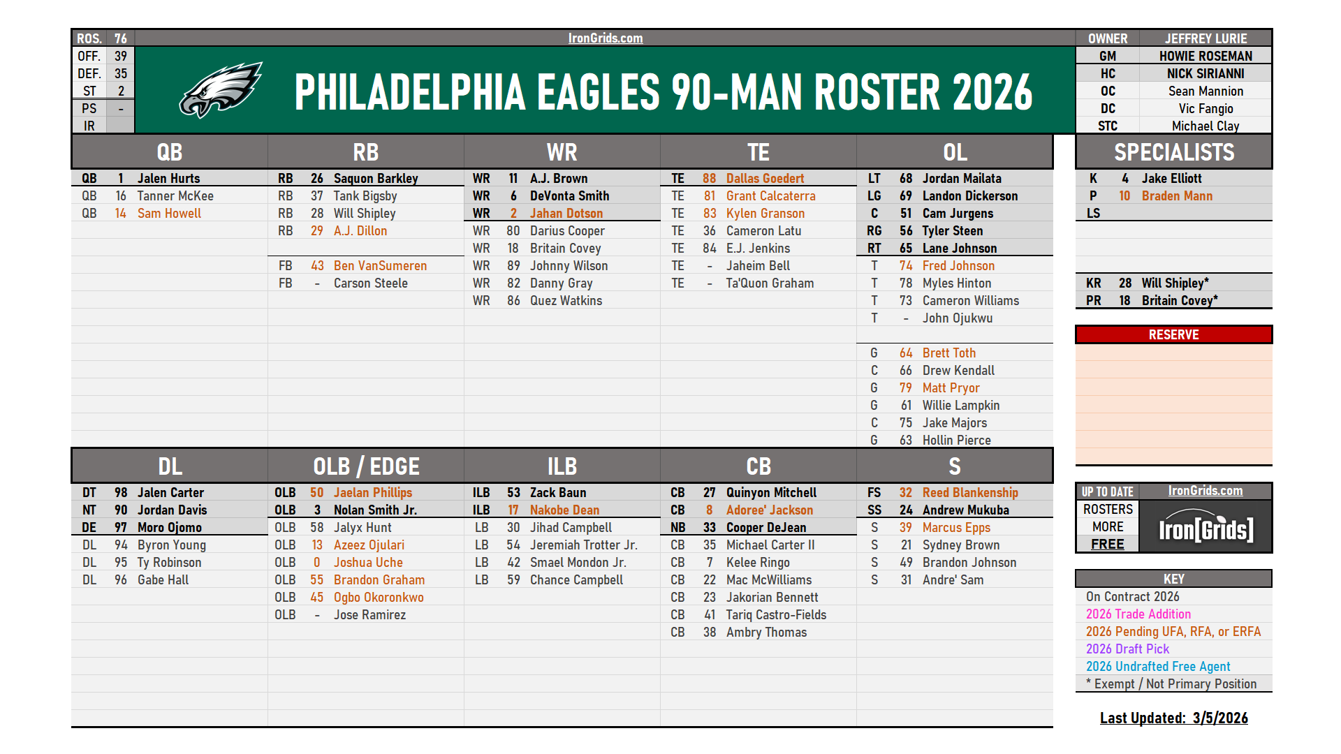 HEADS UP! This page updates once per week every Tuesday. To see the most recent version updated daily & archived rosters, visit our Discord server’s FREE Eagles Channel: