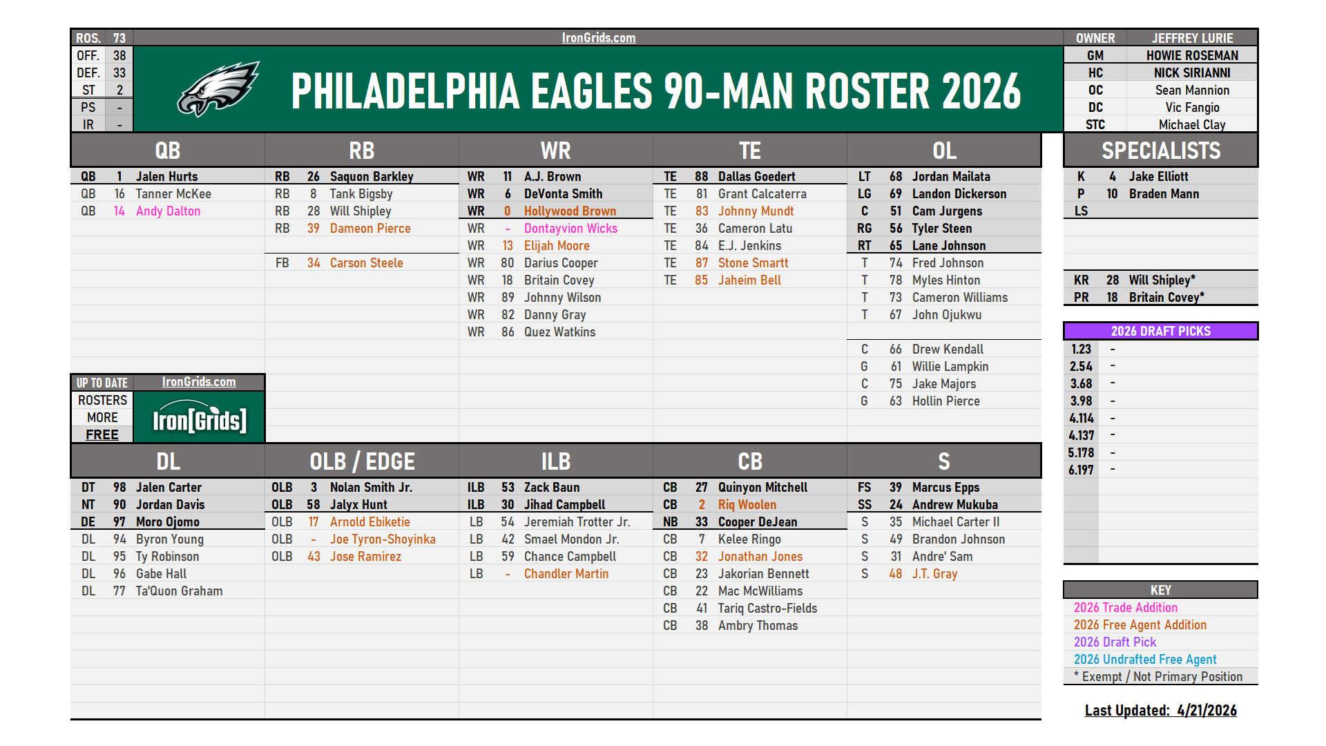 HEADS UP! This page updates once per week every Tuesday. To see the most recent version updated daily & archived rosters, visit our Discord server’s FREE Eagles Channel: DISCORD DISCORD Bookmark this page for quick access! AFC ROSTERS EAST BILLS BILLS DOLPHINS DOLPHINS JETS JETS PATRIOTS PATRIOTS NORTH RAVENS RAVENS BENGALS BENGALS BROWNS BROWNS STEELERS STEELERS SOUTH TEXANS TEXANS COLTS COLTS TITANS TITANS JAGUARS JAGUARS WEST BRONCOS BRONCOS CHIEFS CHIEFS CHARGERS CHARGERS RAIDERS RAIDERS NFC ROSTERS EAST COWBOYS COWBOYS GIANTS GIANTS COMMANDERS COMMANDERS EAGLES EAGLES NORTH BEARS BEARS LIONS LIONS PACKERS PACKERS VIKINGS VIKINGS SOUTH FALCONS FALCONS PANTHERS PANTHERS BUCCANEERS BUCCANEERS SAINTS SAINTS WEST CARDINALS CARDINALS RAMS RAMS SEAHAWKS SEAHAWKS 49ERS 49ERS IRONGRIDS ORIGINALS STANDINGS, SCHEDULES & LANDSCAPES: POCKET SCHEDULE POCKET SCHEDULE SEASON BOARD SEASON BOARD QB LANDSCAPE QB LANDSCAPE COACHING LANDSCAPE COACHING LANDSCAPE TOOLS: OFFSEASON TEMPLATES OFFSEASON TEMPLATES 1ST ROUND DRAFT BOARD 1ST ROUND DRAFT BOARD