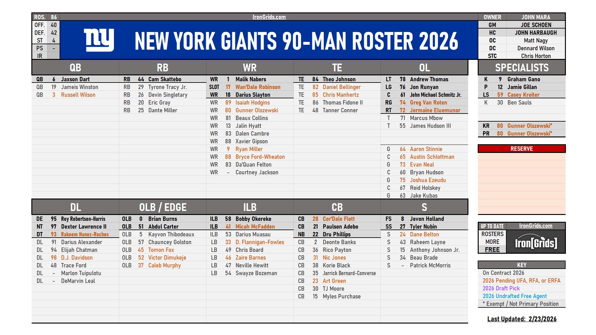 HEADS UP! This page updates once per week every Tuesday. To see the most recent version updated daily & archived rosters, visit our Discord server’s FREE Giants Channel: