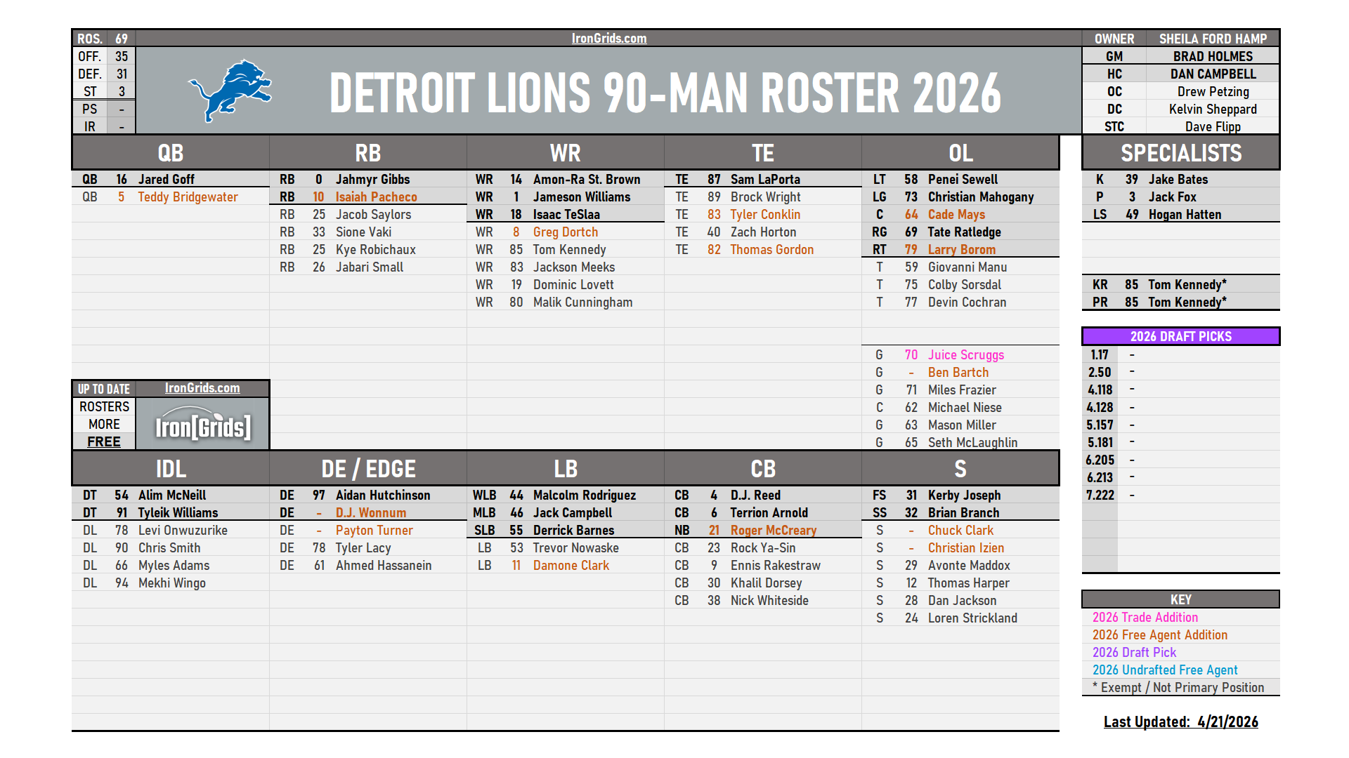 HEADS UP! This page updates once per week every Tuesday. To see the most recent version updated daily & archived rosters, visit our Discord server’s FREE Lions Channel: DISCORD DISCORD Bookmark this page for quick access! AFC ROSTERS EAST BILLS BILLS DOLPHINS DOLPHINS JETS JETS PATRIOTS PATRIOTS NORTH RAVENS RAVENS BENGALS BENGALS BROWNS BROWNS STEELERS STEELERS SOUTH TEXANS TEXANS COLTS COLTS TITANS TITANS JAGUARS JAGUARS WEST BRONCOS BRONCOS CHIEFS CHIEFS CHARGERS CHARGERS RAIDERS RAIDERS NFC ROSTERS EAST COWBOYS COWBOYS GIANTS GIANTS COMMANDERS COMMANDERS EAGLES EAGLES NORTH BEARS BEARS LIONS LIONS PACKERS PACKERS VIKINGS VIKINGS SOUTH FALCONS FALCONS PANTHERS PANTHERS BUCCANEERS BUCCANEERS SAINTS SAINTS WEST CARDINALS CARDINALS RAMS RAMS SEAHAWKS SEAHAWKS 49ERS 49ERS IRONGRIDS ORIGINALS STANDINGS, SCHEDULES & LANDSCAPES: POCKET SCHEDULE POCKET SCHEDULE SEASON BOARD SEASON BOARD QB LANDSCAPE QB LANDSCAPE COACHING LANDSCAPE COACHING LANDSCAPE TOOLS: OFFSEASON TEMPLATES OFFSEASON TEMPLATES 1ST ROUND DRAFT BOARD 1ST ROUND DRAFT BOARD