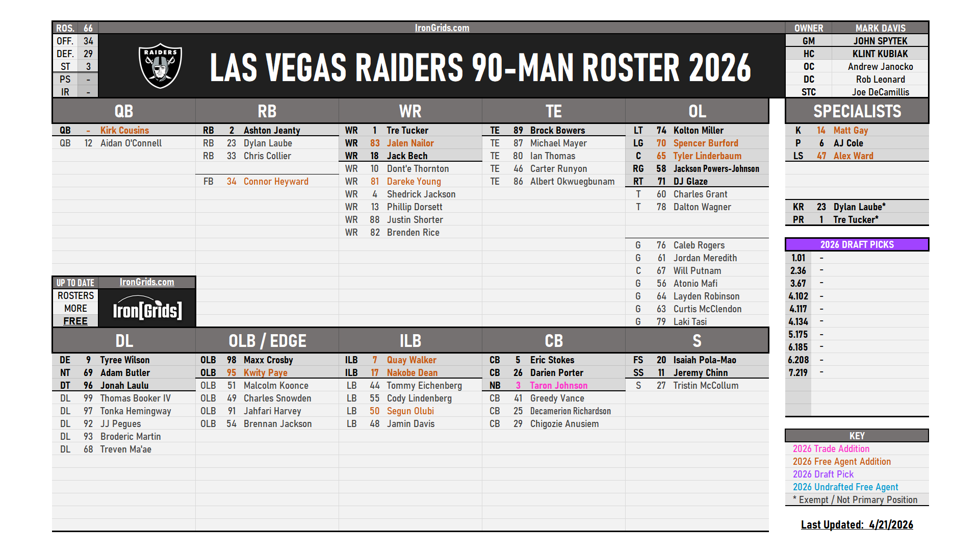 HEADS UP! This page updates once per week every Tuesday. To see the most recent version updated daily & archived rosters, visit our Discord server’s FREE Raiders Channel: DISCORD DISCORD Bookmark this page for quick access! AFC ROSTERS EAST BILLS BILLS DOLPHINS DOLPHINS JETS JETS PATRIOTS PATRIOTS NORTH RAVENS RAVENS BENGALS BENGALS BROWNS BROWNS STEELERS STEELERS SOUTH TEXANS TEXANS COLTS COLTS TITANS TITANS JAGUARS JAGUARS WEST BRONCOS BRONCOS CHIEFS CHIEFS CHARGERS CHARGERS RAIDERS RAIDERS NFC ROSTERS EAST COWBOYS COWBOYS GIANTS GIANTS COMMANDERS COMMANDERS EAGLES EAGLES NORTH BEARS BEARS LIONS LIONS PACKERS PACKERS VIKINGS VIKINGS SOUTH FALCONS FALCONS PANTHERS PANTHERS BUCCANEERS BUCCANEERS SAINTS SAINTS WEST CARDINALS CARDINALS RAMS RAMS SEAHAWKS SEAHAWKS 49ERS 49ERS IRONGRIDS ORIGINALS STANDINGS, SCHEDULES & LANDSCAPES: POCKET SCHEDULE POCKET SCHEDULE SEASON BOARD SEASON BOARD QB LANDSCAPE QB LANDSCAPE COACHING LANDSCAPE COACHING LANDSCAPE TOOLS: OFFSEASON TEMPLATES OFFSEASON TEMPLATES 1ST ROUND DRAFT BOARD 1ST ROUND DRAFT BOARD