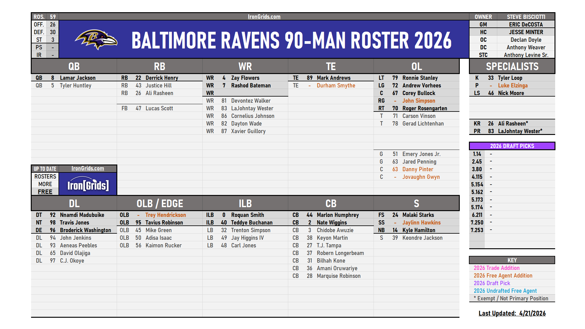 HEADS UP! This page updates once per week every Tuesday. To see the most recent version updated daily & archived rosters, visit our Discord server’s FREE Ravens Channel: DISCORD DISCORD Bookmark this page for quick access! AFC ROSTERS EAST BILLS BILLS DOLPHINS DOLPHINS JETS JETS PATRIOTS PATRIOTS NORTH RAVENS RAVENS BENGALS BENGALS BROWNS BROWNS STEELERS STEELERS SOUTH TEXANS TEXANS COLTS COLTS TITANS TITANS JAGUARS JAGUARS WEST BRONCOS BRONCOS CHIEFS CHIEFS CHARGERS CHARGERS RAIDERS RAIDERS NFC ROSTERS EAST COWBOYS COWBOYS GIANTS GIANTS COMMANDERS COMMANDERS EAGLES EAGLES NORTH BEARS BEARS LIONS LIONS PACKERS PACKERS VIKINGS VIKINGS SOUTH FALCONS FALCONS PANTHERS PANTHERS BUCCANEERS BUCCANEERS SAINTS SAINTS WEST CARDINALS CARDINALS RAMS RAMS SEAHAWKS SEAHAWKS 49ERS 49ERS IRONGRIDS ORIGINALS STANDINGS, SCHEDULES & LANDSCAPES: POCKET SCHEDULE POCKET SCHEDULE SEASON BOARD SEASON BOARD QB LANDSCAPE QB LANDSCAPE COACHING LANDSCAPE COACHING LANDSCAPE TOOLS: OFFSEASON TEMPLATES OFFSEASON TEMPLATES 1ST ROUND DRAFT BOARD 1ST ROUND DRAFT BOARD